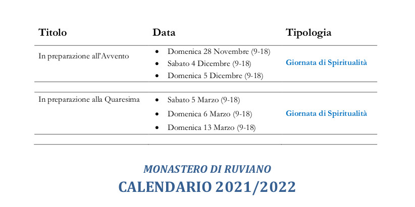 Le giornate di spiritualità hanno luogo ordinariamente all’inizio dell’Avvento, all’inizio della Quaresima.