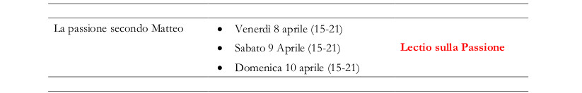 In genere tale lectio avviene in tre turni: al venerdì pomeriggio, al sabato pomeriggio ed al pomeriggio della stessa Domenica delle Palme. Dalle 15,00 alle 21,00 circa ci si pone in ascolto del testo in due meditazioni a cui segue, come conclusione, un momento di preghiera in cui raccogliere quell’ascolto e portarlo davanti al Signore nell’oratio e comunitaria e personale.